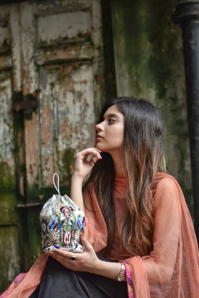 - silvery white potli bag