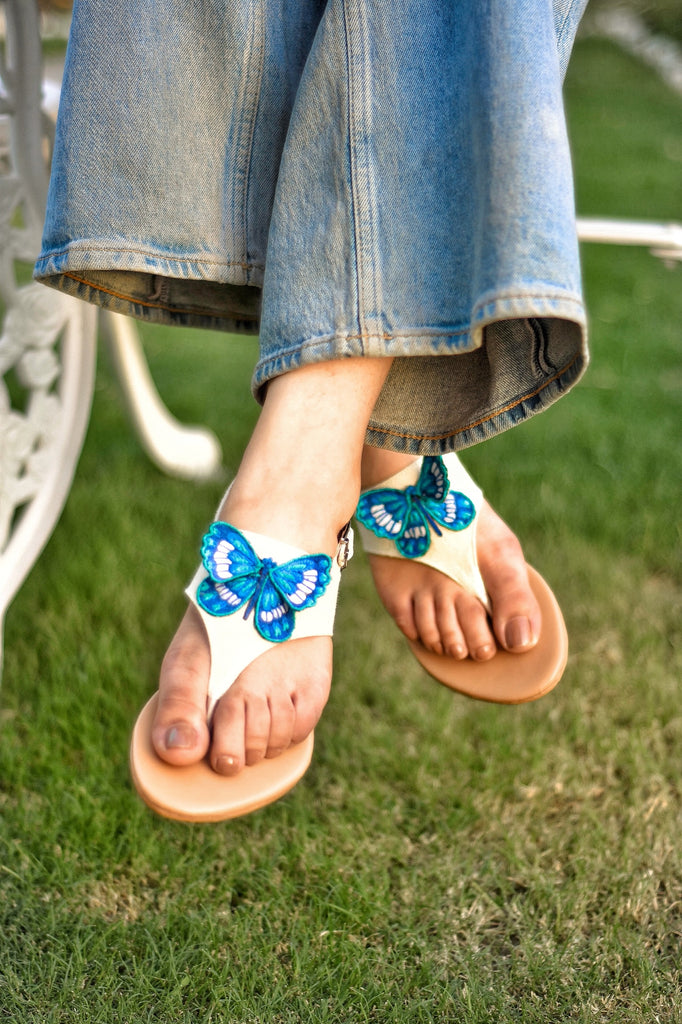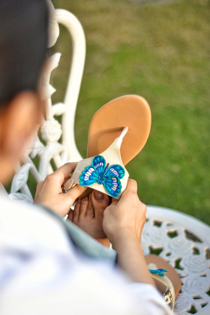 - Simple yet chic summer sandals embellished with intricate hand embroidered butterfly with adjustable wings