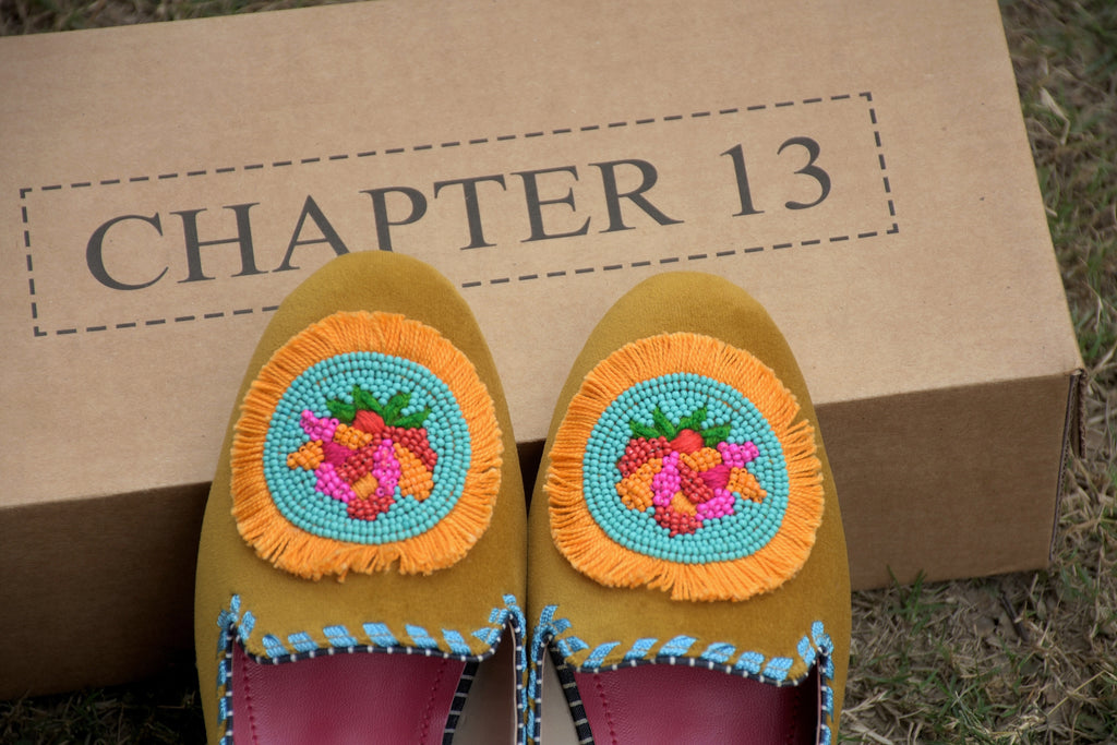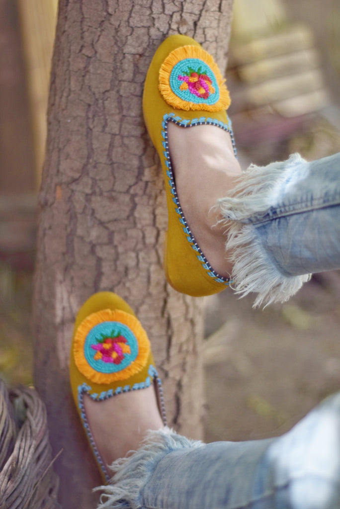 - Multi coloured rose, circular beaded motif in the middle adorned with orange thread fringes
