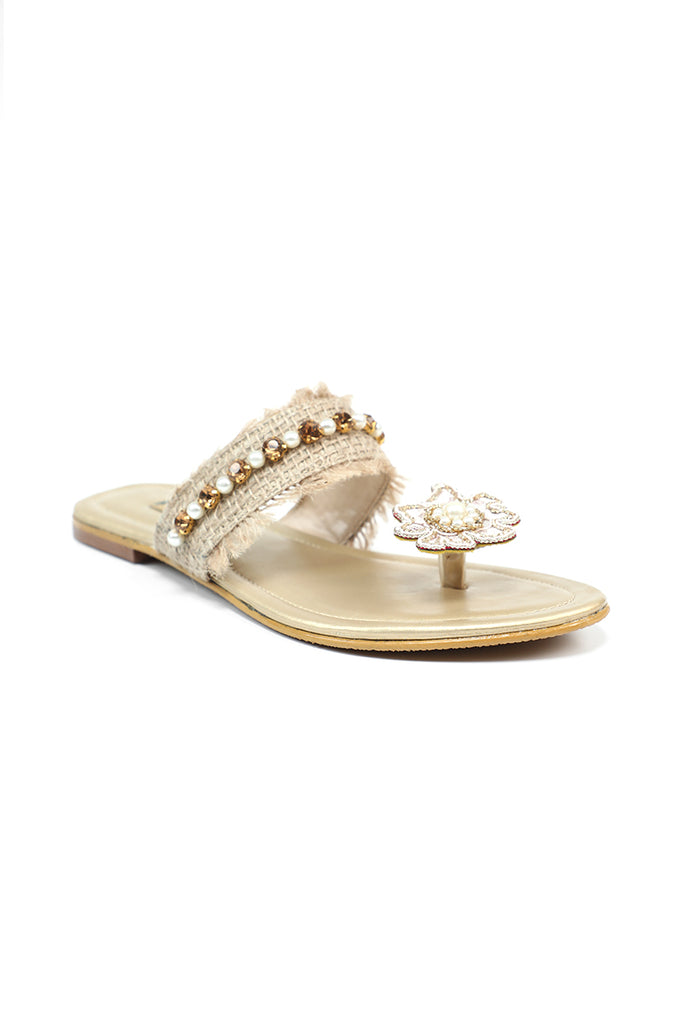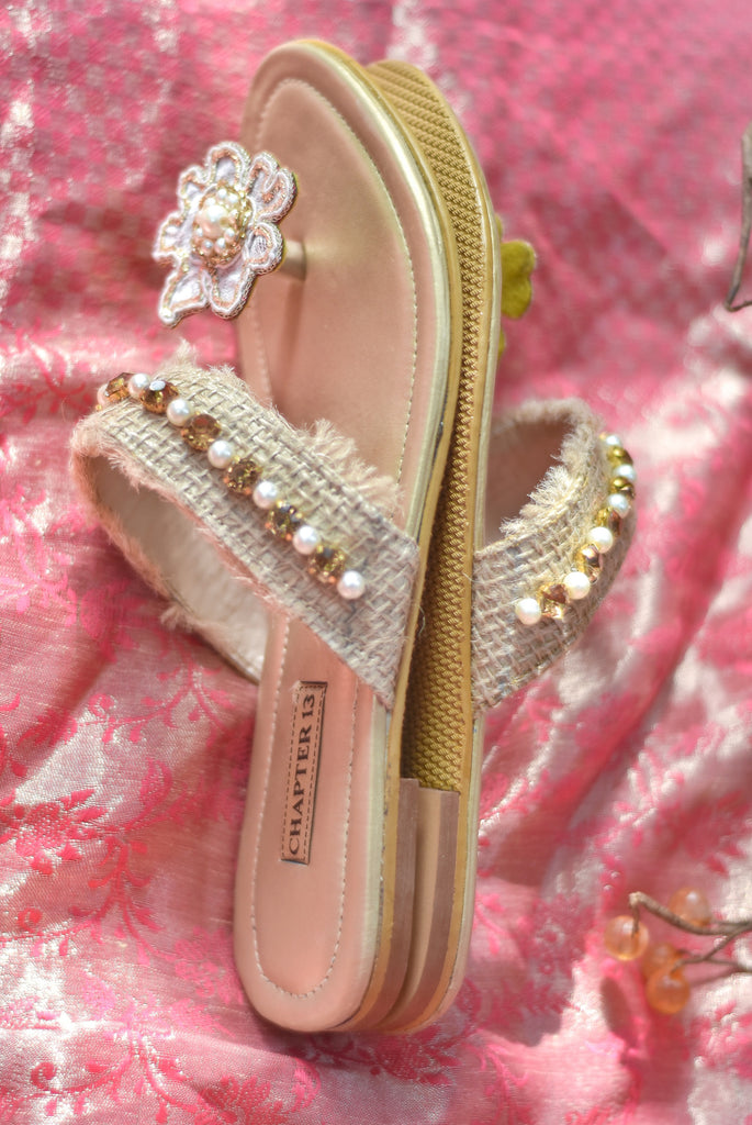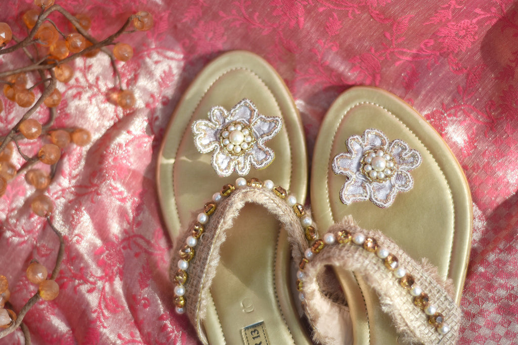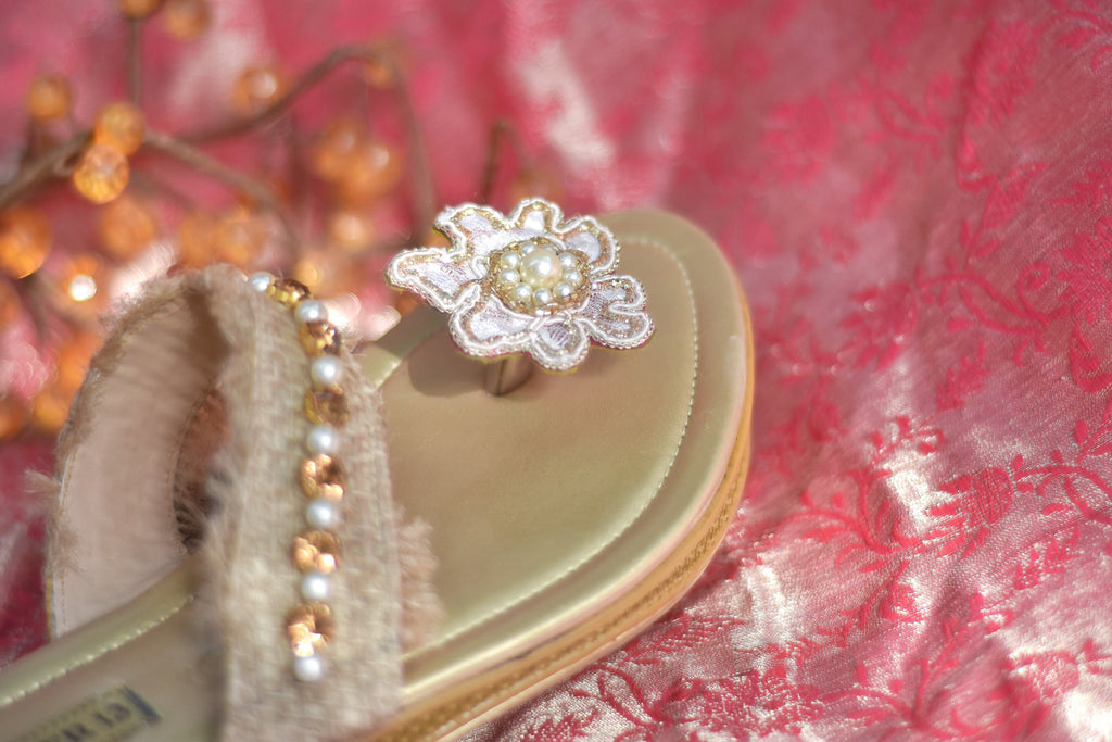 - Beautiful off white net flower toe post embellished with pearls and cut pipes