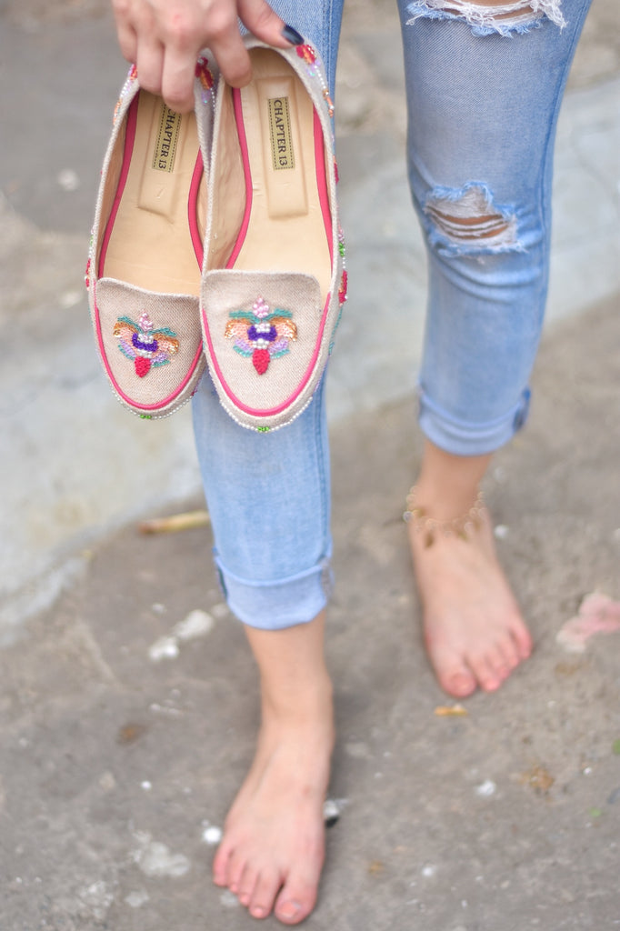 - Motif inspired by french gardens of the rococo era embellished adorn by hues of hot pink, lilac and light green silk threads